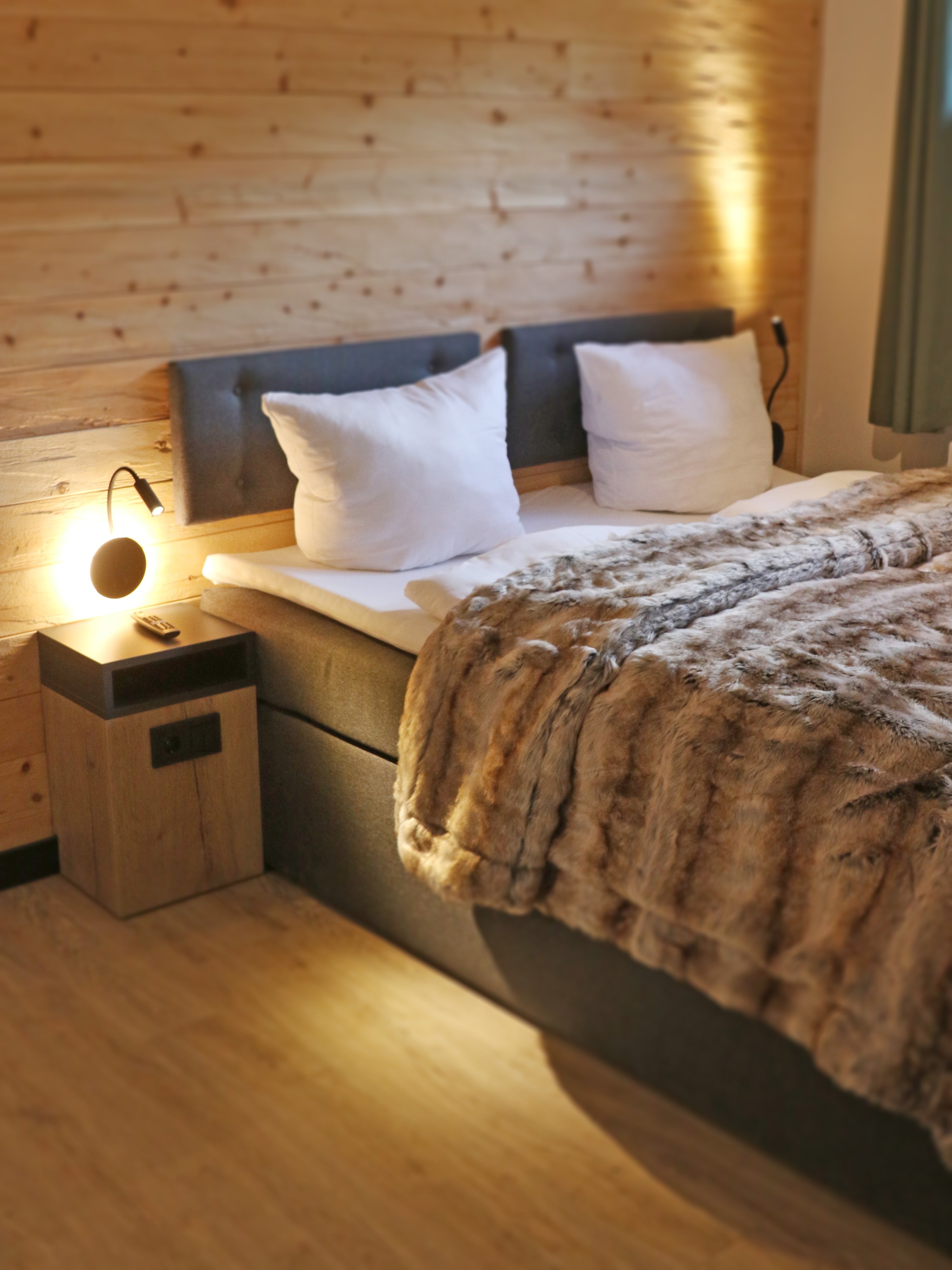 Im Schlafzimmer schlaft Ihr in tollen Boxspringbetten, Kingsize 1,80 x 2,00 m, mit extra Zirbenholz an der Rückwand. Unser Schrankbett 1,00 x 2,00 m mit vollwertiger Matratze erwartet Euch im Wohnzimmer.