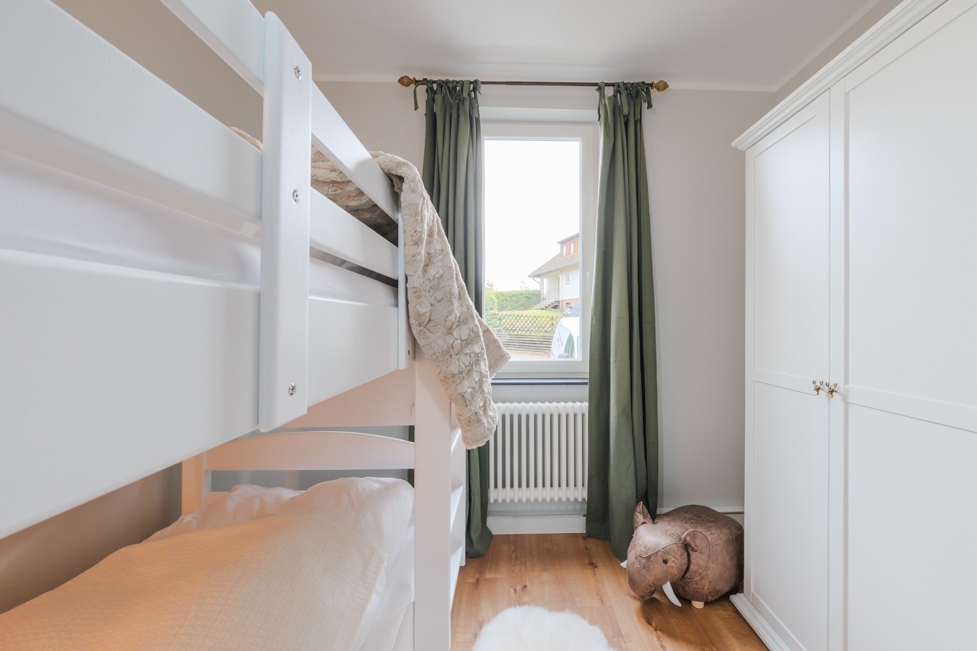 Ihr schlaft in tollen Kingsize-Doppelbetten, 1,80 x 2,00 m im Schlafzimmer. Unser hochwertiges Doppelstockbett 90 x 2,00 m mit vollwertiger Matratze erwartet Euch im anderen Schlafzimmer. Hier befindet sich auch das 5te Bett (90 x 1,90 m), das als Bettschublade unter dem Doppelstockbett herausgezogen wird. Unsere Betten sind alle fuer Allergiker geeignet.